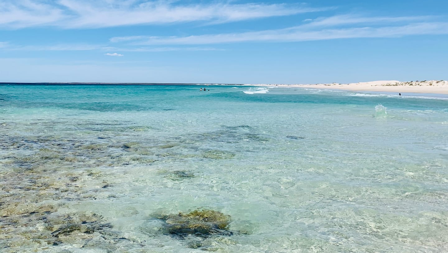 ButtonLong white sandy beaches, blue seas framed by the striking orange cliffs, you can walk for miles and discover hidden caves and beautiful seashells. Can you spot our golden retriever?